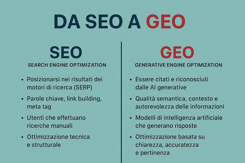 Il passaggio dalla SEO tradizionale alla GEO segna un cambiamento profondo nel modo in cui i contenuti vengono valutati e mostrati online. Se prima l’obiettivo era ottenere un buon posizionamento organico nei risultati di ricerca, oggi la sfida è diventare una fonte citabile dalle intelligenze artificiali generative.
